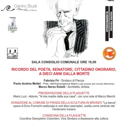 RICORDO DEL POETA MARIO LUZI Sabato 28 Marzo 2015 Nel decennale della morte di Mario Luzi (2005-2015) il Comune di Pienza, il Teatro Povero di Monticchiello e il Centro Studi Mario Luzi “La Barca” propongono un doppio appuntamento il giorno 28 marzo 2015. Alle ore 16,00 nella sala consiliare del Comune interventi di Paolo Andrea…