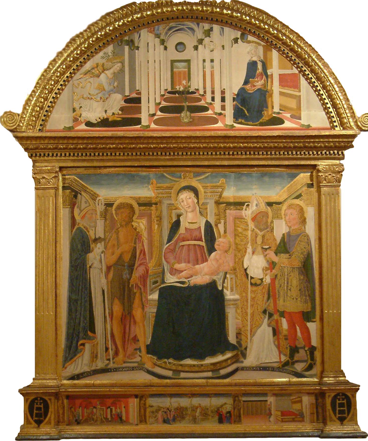 Lorenzo di Pietro detto il Vecchietta, Madonna col Bambino in trono tra i Santi Biagio, Giovanni Battista, Nicola e Floriano, (1460 -62)